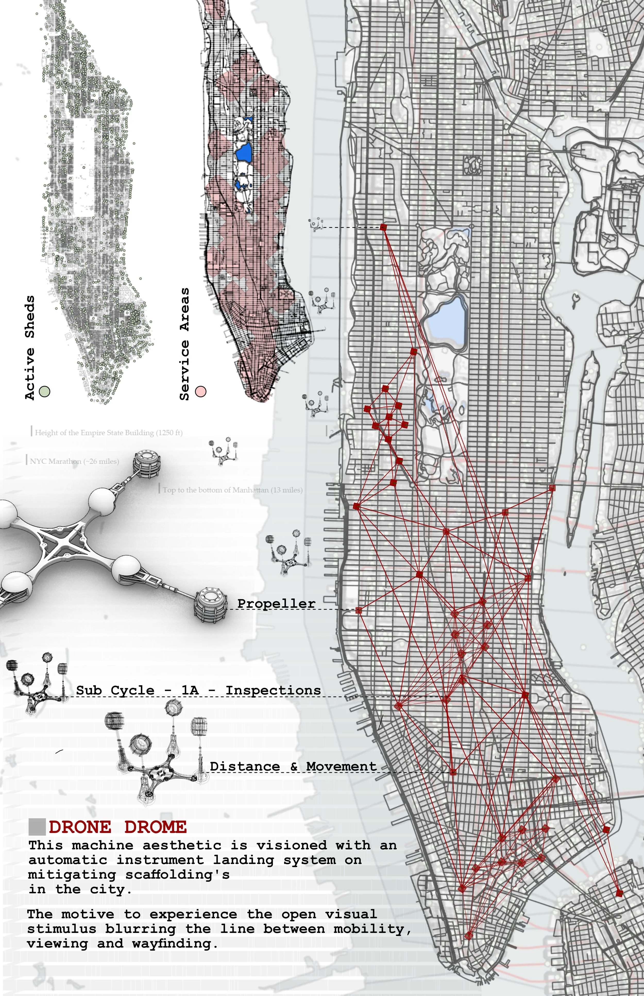 Dronedrome is a modular, networked hub for drone operations, designed as both a performance space for aerial robotics and a functional logistics node for inspection, mapping, and environmental monitoring. Conceived as a hybrid between an airfield, data center, and public forum, it integrates landing pads, charging stations, maintenance bays, and real-time data visualization walls.